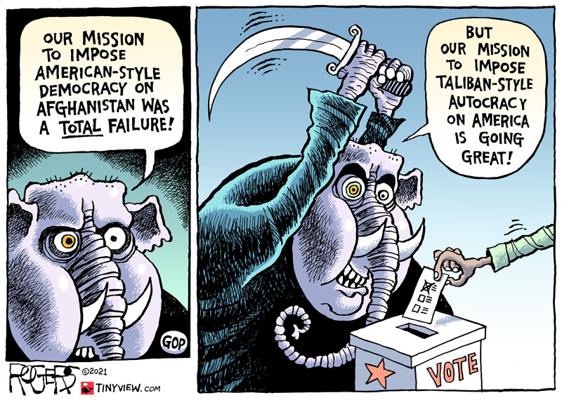 Half the country does not believe in Democracy, rejects the very word in an inane belief that the very word favors the Democrats. You cannot have Democracy if half the country rejects the principle, if a quarter consider their guy infallible and inviolate.