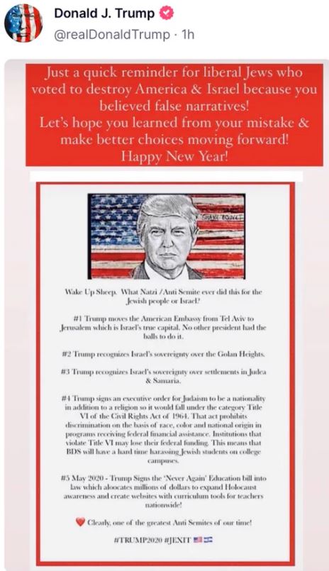He celebrated Rosh Hashanah by tweeting a graphic claiming he had done wonderful things for the Jewish people while berating the vast majority who never voted for him: “A reminder for liberal Jews who voted to destroy America & Israel because you believed false narratives! Let’s hope you learned from your mistake & make better choices moving forward!” Trump thinks if you didn’t vote for him, you are in support of “destroying America and Israel.” Remember that, my Jewish friends: Trump may constantly push standard anti-semitic conspiracy theories while claiming that Nazis and Klan members contain “good people” but he’s really on your side — you’re just too stupid to realize it.