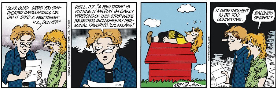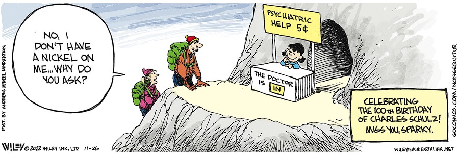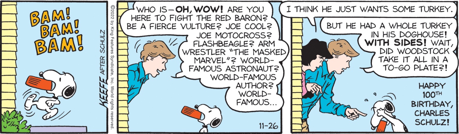 Charles M. Schulz would have been 100 years old today, and all his comic strip friends decided to honor him and his great influence. Here are a few of my favorites.