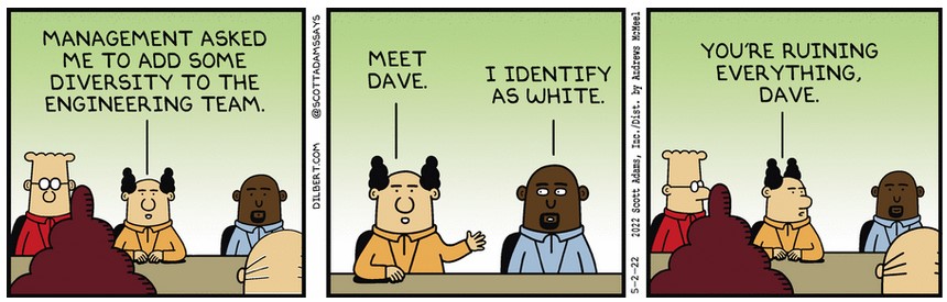 And over the years, as he spouted more and more crazy, right-wing Trumpy proclamations, I decided I had had enough and stopped buying his cartoon books or reading the comic. Saying that his Dilbert TV show had been cancelled because he was “white” didn’t help.