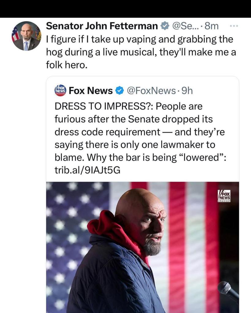 Forget the terrible problems facing our country today. What has conservatives mad? That my senator John Fetterman doesn’t like to wear a suit.