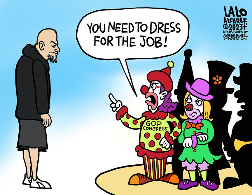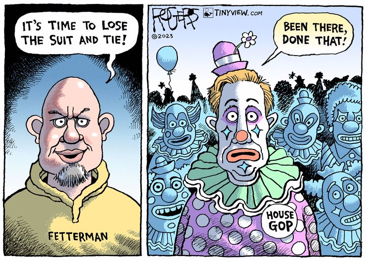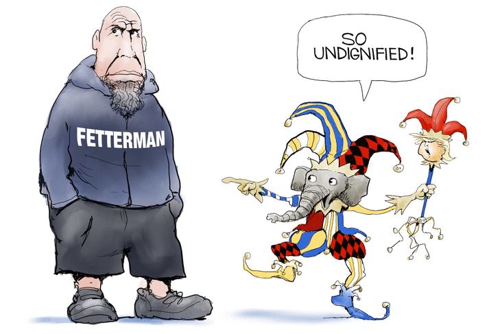 Anyway, political cartoonists had fun with this, so I thought I’d share these, along with a post from Fetterman referring to a certain Republican who was recently kicked out a play for vaping marijuana, talking during the performance, and groping her partner — and to which the Republicans have been amazingly silent about.