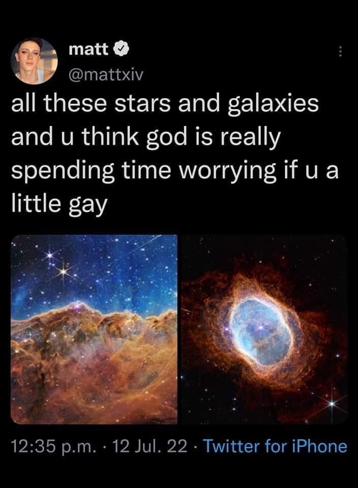 Some said the universe is just too beautiful and there are things that can’t be explained, and therefore that’s why they believe. But to me, that’s such a jump. “I can’t understand how the universe could be this beautiful. Therefore it HAD to be designed and created that way.”